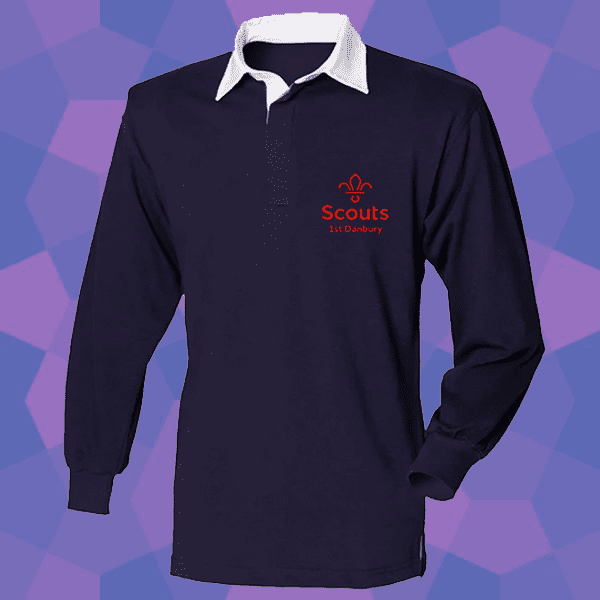 270gsm, 100% cotton, navy rugby shirt with white collar and the 1st Danbury logo embroidered in red to the left chest.