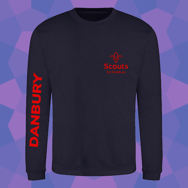 80% Ringspun cotton, 20% Polyester navy sweatshirt with the 1st Danbury logo embroidered to the left chest and “Danbury” printed on the right arm.
