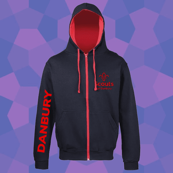 80% Ringspun cotton, 20% Polyester zoodie in navy and red with the 1st Danbury logo embroidered in red to the left chest.